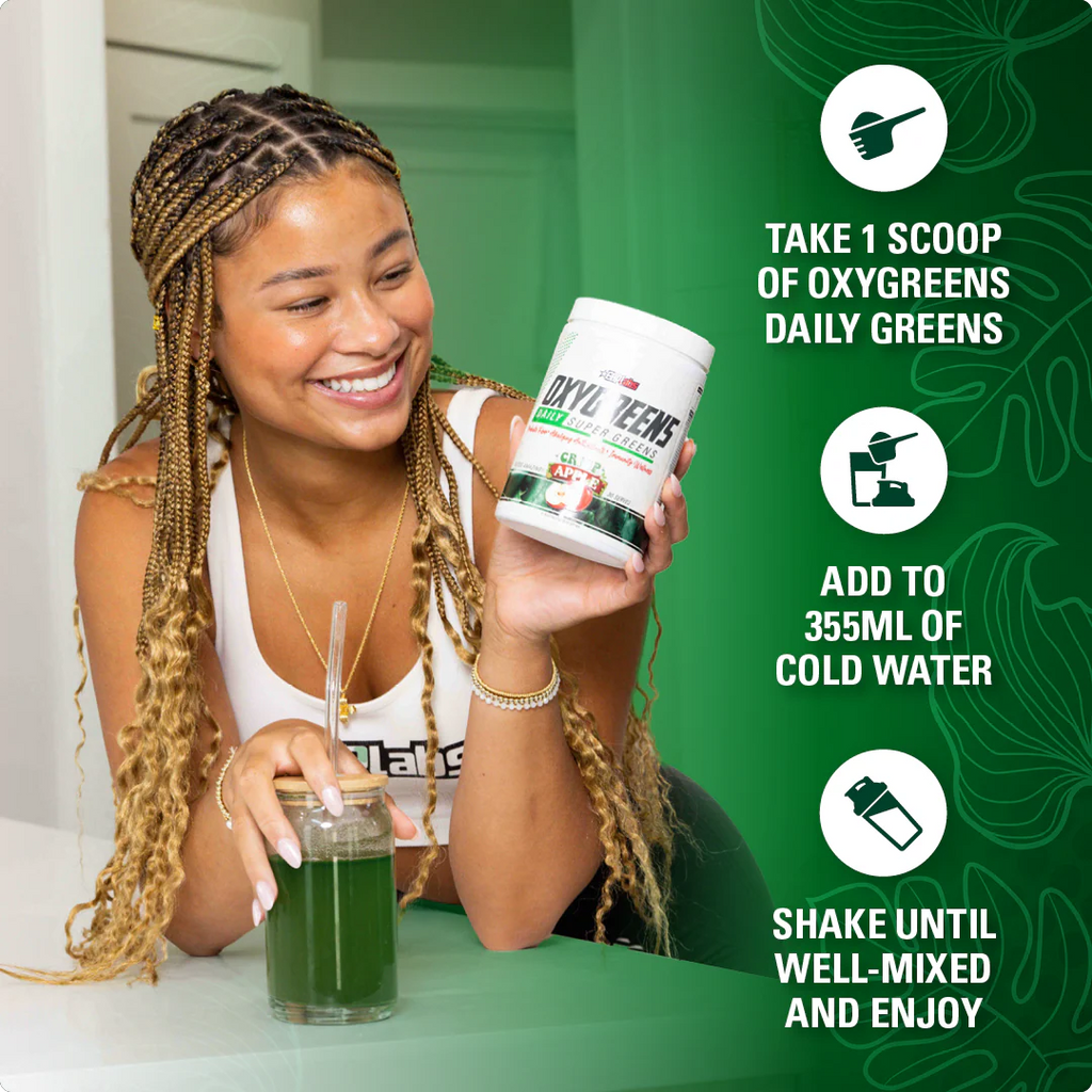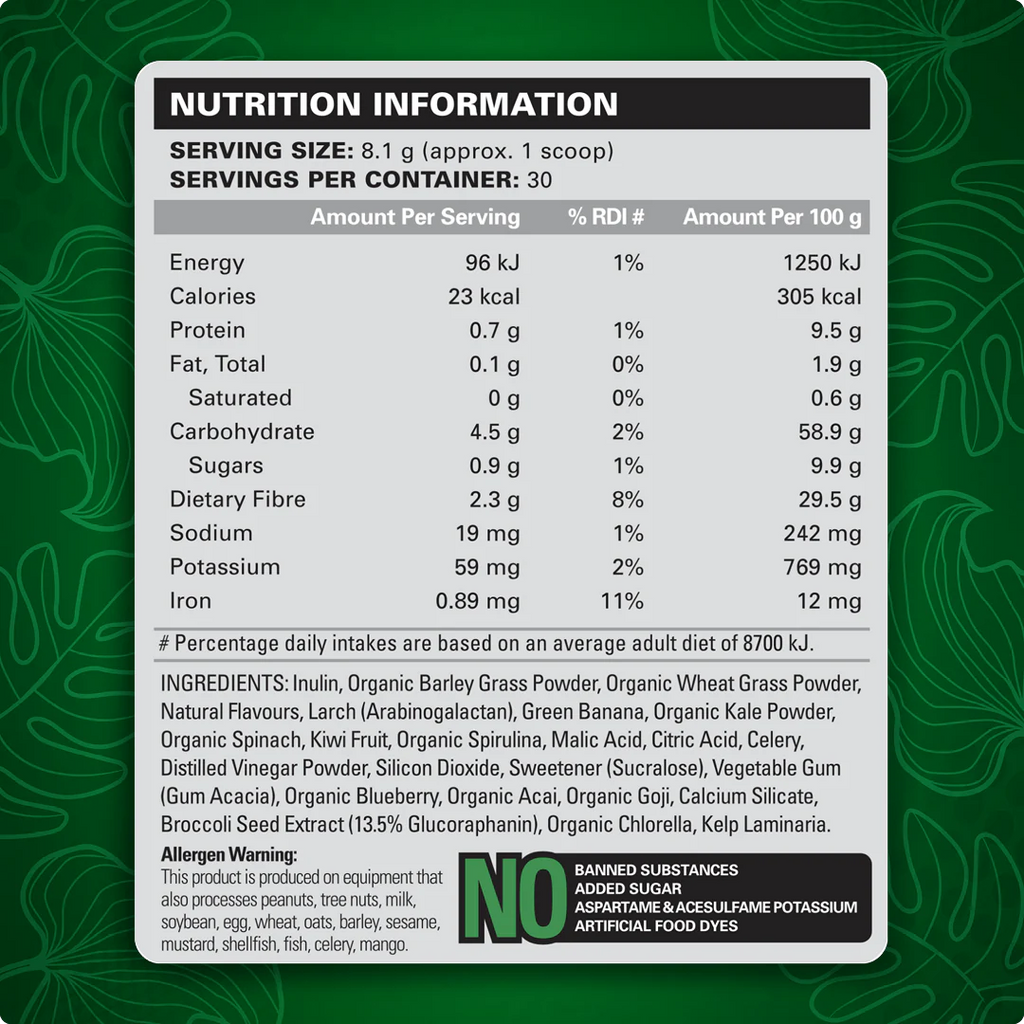 Inulin, Organic Barley Grass, Organic Wheat Grass, Larch (Arabinogalactan), Green Banana, Organic Kale, Organic Spinach, Organic Spirulina, DL-Malic Acid, Natural Flavours, Citric Acid, Celery, Kiwi Fruit, Sweetener (Sucralose), Silicon Dioxide, Organic Acai, Calcium Silicate, Organic Goji Fruit Extract, Organic Chlorella, Blueberry, Broccoli Seed Extract (13.5% Glucoraphanin), Kelp Laminaria.