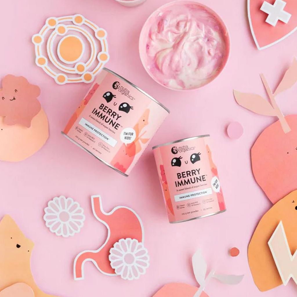 Super Berries (42 %) (Strawberry*, Wildcrafted Sea Buckthorn*, Blueberry*, Cranberry, Acai Berry*), Lucuma*, Rice Milk*, Beetroot*, Natural Plant Based Flavours, Mango, Rice Fibre*, Bamboo Stem Extract, Natural Plant Extracts (Curry Leaf, Guava Leaf), White Button Mushroom Extract*. *Certified Organic Ingredients