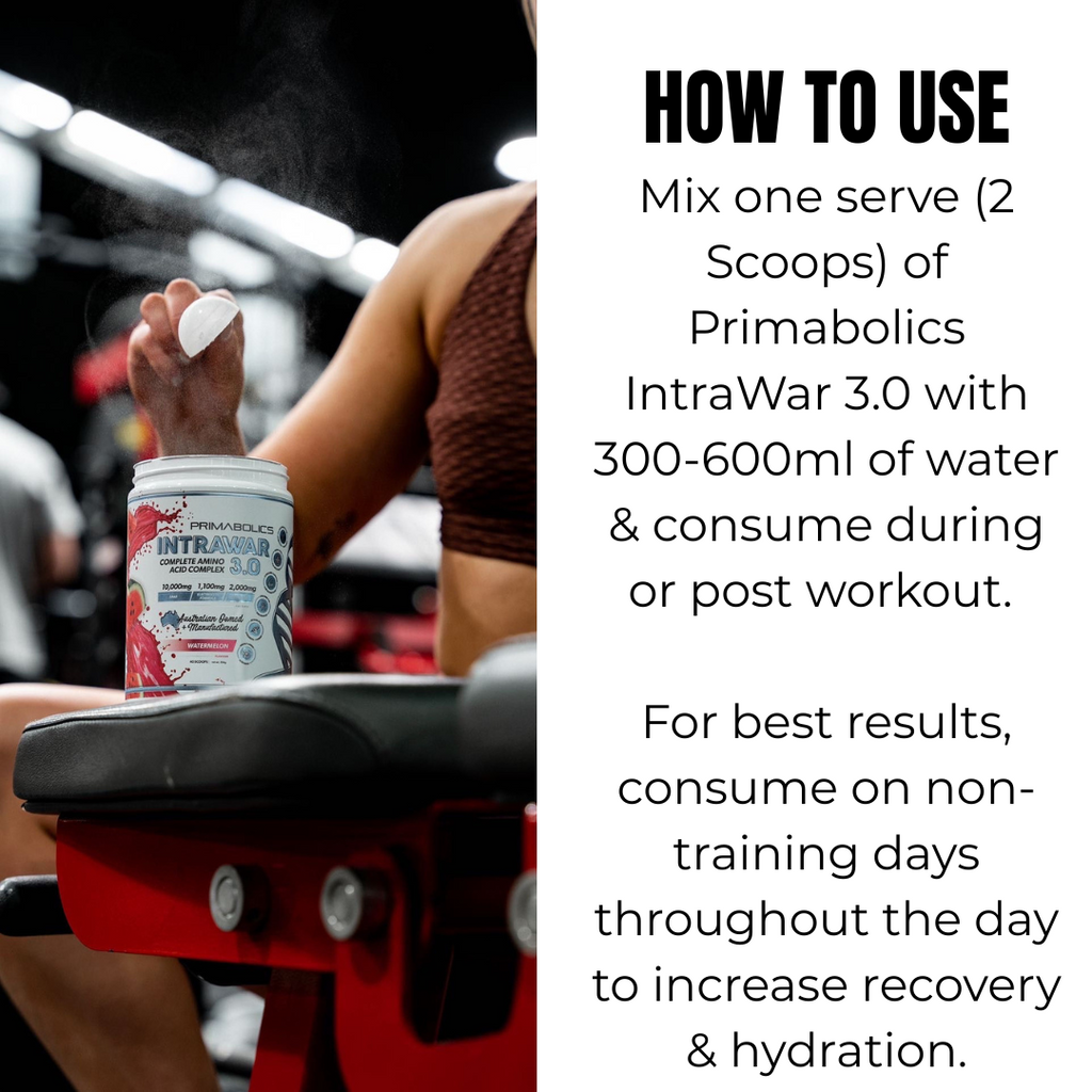 Mix one serve (2 Scoops) of Primabolics IntraWar 3.0 with 300-600ml of water & consume during or post workout. For best results, consume on non-training days throughout the day to increase recovery & hydration.