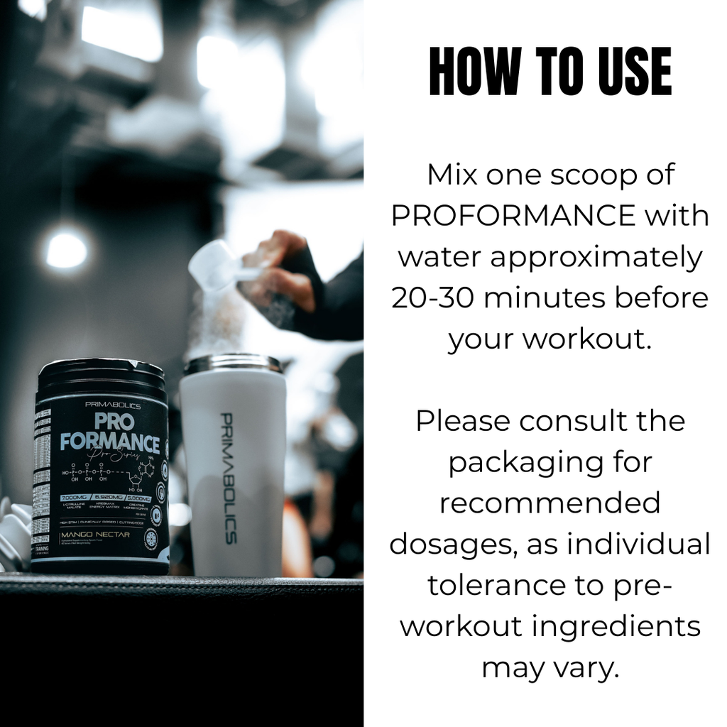Mix one scoop of PROFORMANCE with water approximately 20-30 minutes before your workout.