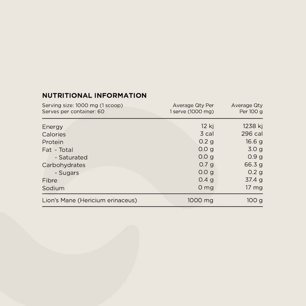 INGREDIENTS: 100% Certified Organic Dual Extraction Lions mane Fruiting Body (naturally occuring >20% Beta Glucan, >20% polysaccharides, >2% Erinacine A, >1% Hericenone)