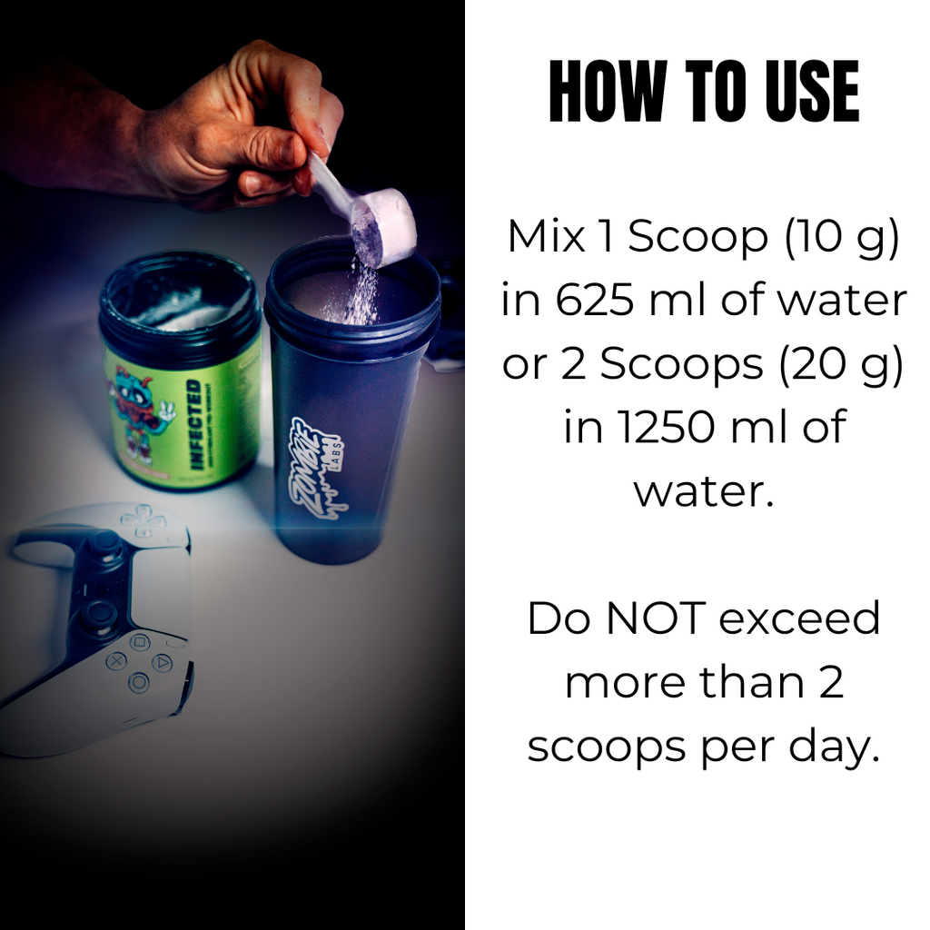 Mix 1 Scoop (10 g) in 625 ml of water or 2 Scoops (20 g) in 1250 ml of water.